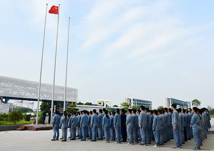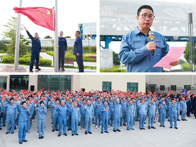 上午8時,升國旗儀式正式開始。全體人員列隊肅立,身姿挺拔的升旗手、護(hù)旗手昂首闊步護(hù)送國旗進(jìn)場。“升國旗、唱國歌!”隨著嘹亮的口令響起,現(xiàn)場員工以莊嚴(yán)的注目禮追隨著國旗冉冉升起,飽含深情齊唱國歌。鮮艷的五星紅旗迎風(fēng)飄揚,每位員工的心中都充滿了對祖國的無限熱愛和深深祝福。